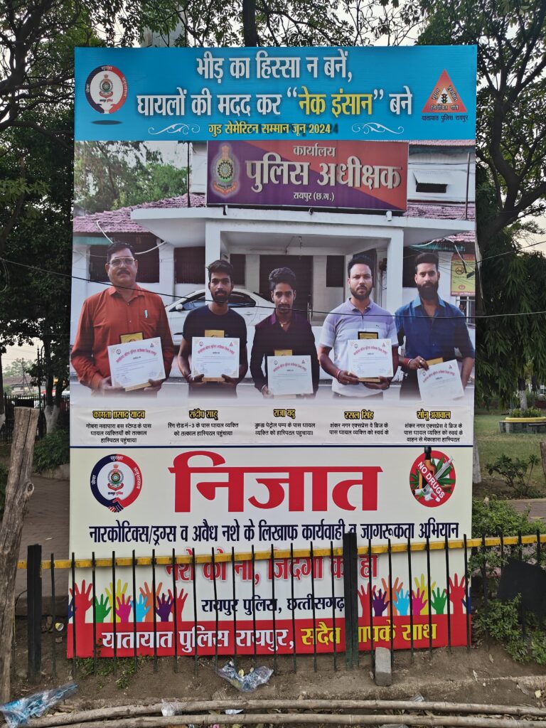 इस क्रम में आज दिनांक 05 जून 2024 को रायपुर जिले में घटित विभिन्न सड़क दुर्घटनाओं में घायलों की मदद करने वाले गुड सेमेरिटंस को एसएसपी रायपुर द्वारा मोमेंटो व प्रशस्ति पत्र देकर सम्मानित किया गया और इनके फोटो बड़े-बड़े होर्डिंग्स में लगाने के निर्देश भी दिए गए।