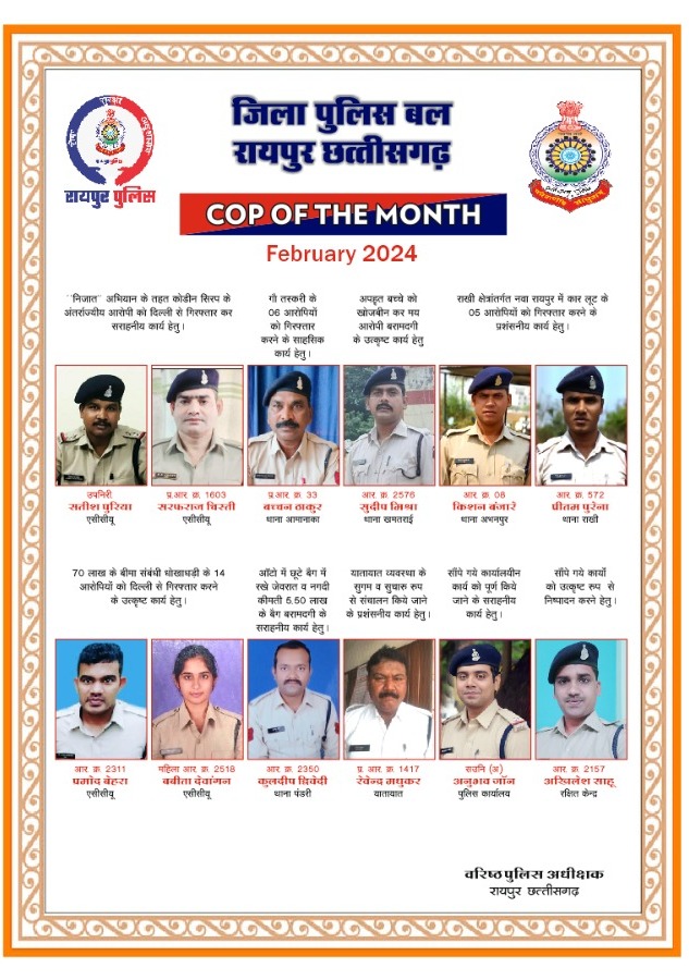 रायपुर जिले के बारह पुलिस अधिकारी-कर्मचारी बने माह फरवरी 2024 हेतु ‘कॉप ऑफ द मंथ’