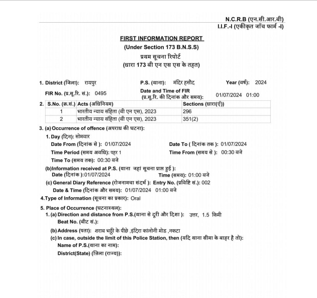 रायपुर: रायपुर के थाना मंदिर हसौद में नए अपराधिक कानून के अनुसार प्रार्थी नोहर दास रात्रे की रिपोर्ट पर अनावेदक अमित सिंह राजपूत के विरुद्ध गाली-गलौच और जान से मारने की धमकी देने के आरोप में अपराध क्रमांक 495/24 के तहत मामला दर्ज किया गया है। इस मामले में भारतीय न्याय संहिता (BNS) की धारा 296 और 351(2) के तहत अपराध पंजीबद्ध किया गया है। पहले यह मामला भारतीय दंड संहिता (IPC) की धारा 294 और 506 के तहत दर्ज होता था।