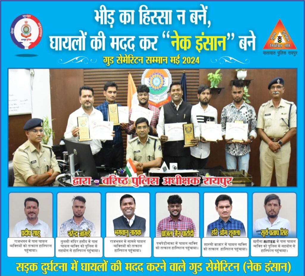 बता दें कि भारत देश में प्रति वर्ष सड़क दुर्घटना में लगभग डेढ़ लाख लोगों की मृत्यु होती है, जिसका प्रमुख कारण घायलों को त्वरित चिकित्सा सहायता नहीं मिलने के कारण होता है। सड़क दुर्घटना के दौरान 60 मिनट का समय गोल्डन आवर कहलाता है इस दौरान यदि घायल व्यक्ति को किसी भी प्रकार से हास्पिटल तक पहुंचा दिया जाए या फिर चिकित्सा व्यवस्था उपलब्ध करा दिया जाए तो घायल की जान बचाई जा सकती है। किन्तु अधिकांश सड़क दुर्घटनों में लोगों द्वारा बार-बार पेशी जाना पड़ेगा व पुलिस द्वारा बार-बार पूछताछ के लिए आना पडे़गा, इससे परेशानी होगी सोचकर मोबाइल फोन से वीडियो-फोटो बना लिया जाता है किन्तु घायल की जान बचाने हेतु कोई उपाय नही किया जाता। जिससे घायल व्यक्ति त्वरित उपचार के अभाव में दम तोड़ देता है। जिसे दृष्टिगत रखते हुए वरिष्ठ पुलिस अधीक्षक जिला रायुपर संतोष कुमार सिंह द्वारा सभी थाना प्रभारियों को निर्देशित किया है कि थाना क्षेत्र में घटित सड़क दुर्घटना में घायल को त्वरित सहायता पहुंचाने हेतु गुड सेमेरिटंस का अधिक से अधिक प्रचार-प्रसार करने एवं घायल को त्वरित सहायता पहुंचाकर जान बचाने वाले गुड सेमेरिटंस को प्रोत्साहित व पुरस्कृत करने हेतु उपस्थित कराने निर्देशित किया गया है। इसी क्रम में दिनांक 14 मई 2024 को रायपुर जिले में घटित विभिन्न सड़क दुर्घटनाओं में घायलों की मदद करने वाले गुड सेमेरिटन को वरिष्ठ पुलिस अधीक्षक जिला रायपुर संतोष कुमार सिंह द्वारा मोंमेंटो व प्रशस्ति पत्र देकर सम्मानित किया गया तथा इनका फोटोयुक्त होर्डिंग शहर के विभिन्न स्थानों पर लगाया जाएगा।