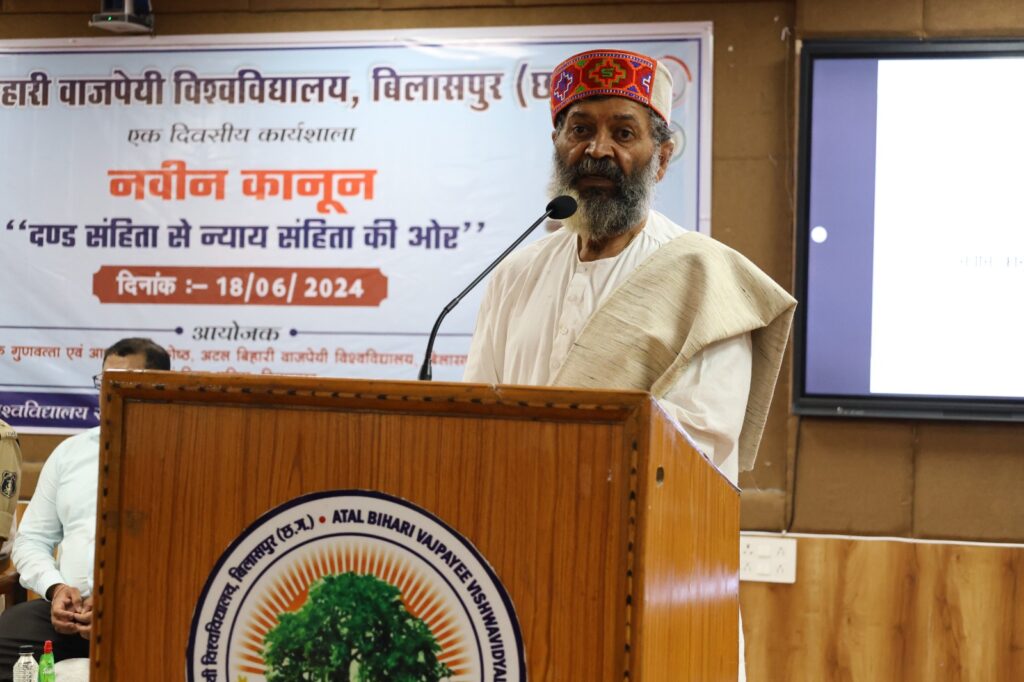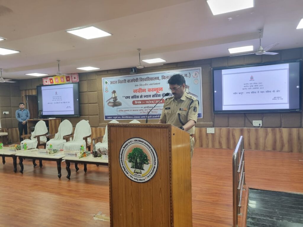 बिलासपुर: अटल बिहारी वाजपेई विश्वविद्यालय बिलासपुर के आंतरिक गुणवत्ता प्रकोष्ठ और जिला पुलिस बिलासपुर के संयुक्त तत्वावधान में “नवीन कानून दंड संहिता से न्याय संहिता की ओर” एक दिवसीय कार्यशाला का आयोजन किया गया। इस कार्यक्रम के मुख्य अतिथि बिलासपुर जिले के पुलिस अधीक्षक श्री रजनेश सिंह थे एवं कार्यक्रम की अध्यक्षता कुलपति आचार्य ए डी एन वाजपेई ने की।